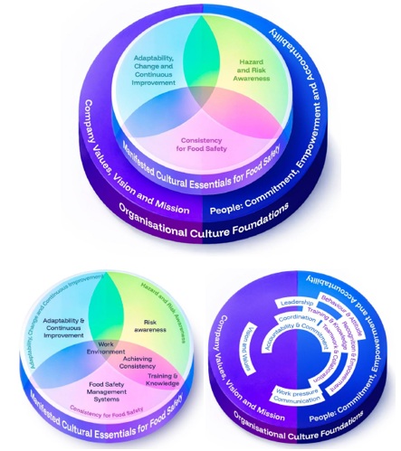 A iniciativa reconhece que a cultura não é um conceito “abstrato”, mas sim um determinante crucial dos resultados em segurança de alimentos. Com base em mais de 180 fontes — incluindo estudos empíricos, teoria comportamental, pesquisa organizacional e normas da indústria — esta edição propõe um modelo revisado de cinco dimensões para a cultura de segurança de alimentos. Essas dimensões são organizadas em dois níveis, refletindo a distinção entre os fatores fundamentais da cultura organizacional e as manifestações culturais na prática de segurança de alimentos. Não é meramente produto de liderança ou treinamento, mas sim uma estrutura integrada de valores compartilhados, comportamentos, consciência de riscos e aprendizado organizacional. Para ser eficaz, a cultura deve ser mensurável, acionável e continuamente aprimorada. A literatura destaca ainda a interação dinâmica entre sistemas formais (como HACCP e SGSA) e elementos culturais informais (incluindo o tom da liderança, o empoderamento dos funcionários e a consistência comportamental).